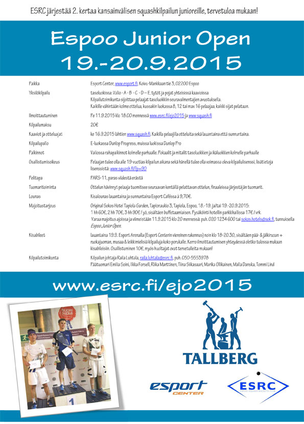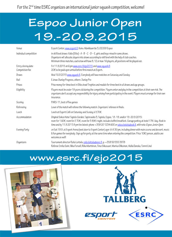 Espoo Junior Open syys 17, 2015 | Tulostiedotteet, Uutisia | 0 Kommenttia ESRC järjestää Espoo Junior Openin Esport Centerissä 19.-20.9.2015. Kaaviot on julkaistu Tournamentsoftwaressa.