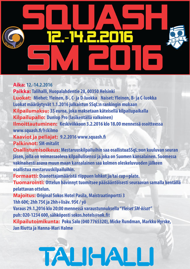 Helsingin Squashkerho järjestää yleisten luokkien SM-kilpailut Talihallissa 12.-14.2.2016. Kaaviot on julkaistu tournamentsoftwaressa.