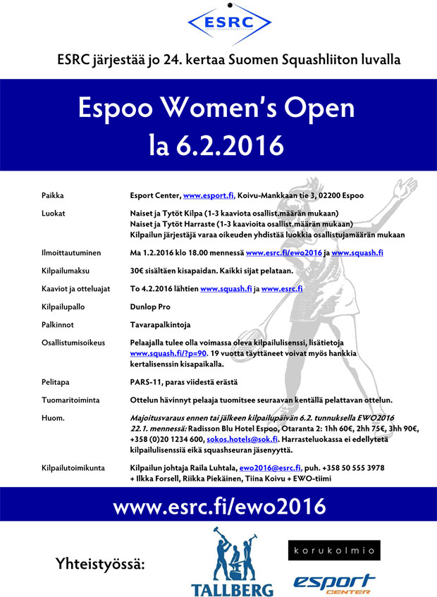Emilia Soini otti selvän voiton Espoo Women’s Openissa lauantaina Esport Centerissä. Loppuottelussa Soini löi Itävallan ESRC:tä edustavan Birgit Coufalin erin 3-0. Pronssiottelussa Riina Koskinen voitti Kristina Mustosen 3-0.