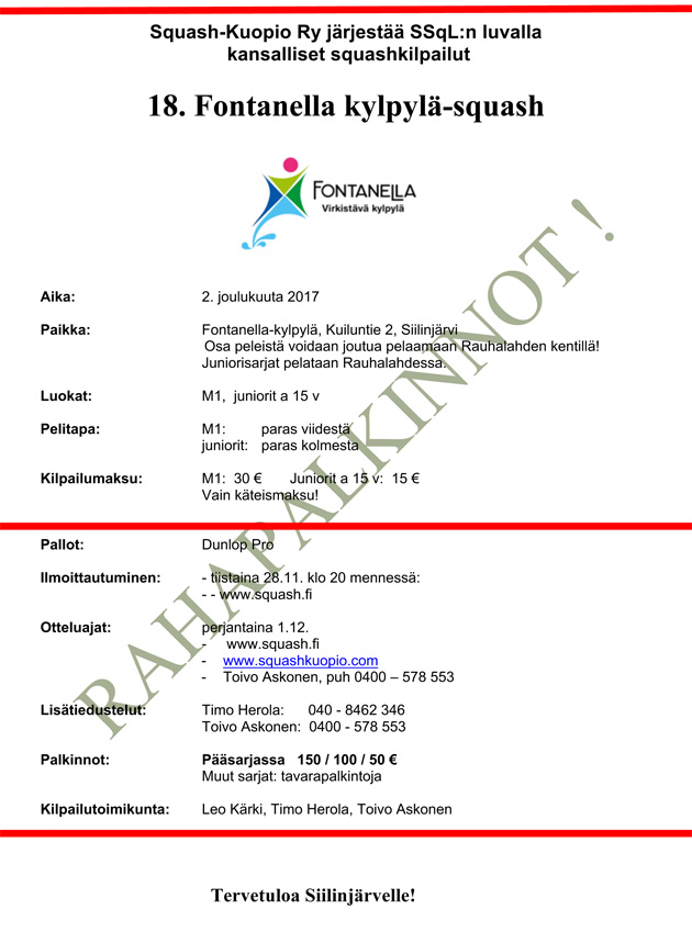 Samuli Niskala löi Ville Koskisen erin 3-1 Squash Kuopion Fontanella kylpylä-squash-turnauksessa Siilinjärvellä.