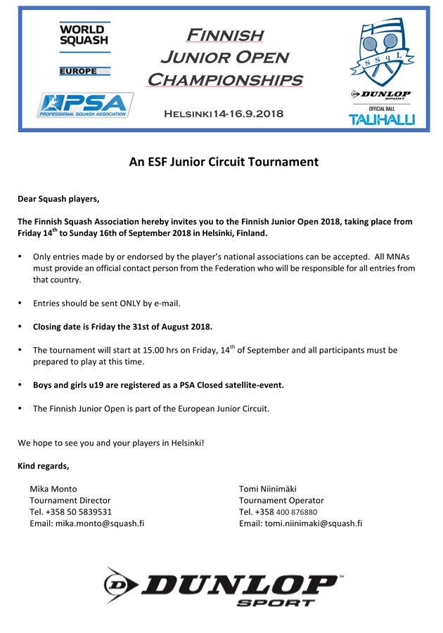 Jokaisella Finnish Junior Openiin (kuten muihinkin Euroopan Squash Federationin juniorikilpailuihin) osallistuvalla pelaajalla on oltava SPIN –tunnus (Squash Personal Identification Number). Jos olet hankkinut SPIN-tunnuksen ennen 31.12.2017, on tunnuksesi voimassa elinikäisesti. Sen sijaan 1.1.2018 jälkeen hankittava uusi SPIN-tunnus on voimassa vain hankintavuoden ajan. Ensimmäisen vuoden hankintahinta (registration fee) on 15 Englannin puntaa. Seuraavina vuosina SPIN’in uusimismaksu (annual renewal fee) on junioreilta 5 Englannin puntaa.