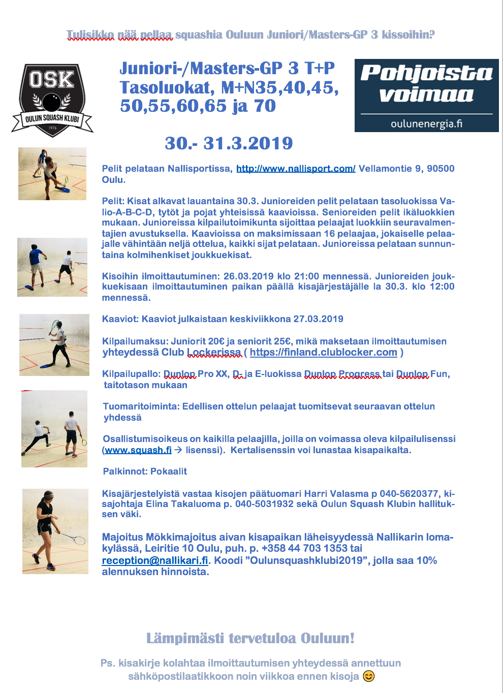 OSK järjestää Nallikarissa kauden kolmannen juniori-/masters-GP -turnauksen. Kaaviot ja peliajat löytyvät Club Lockerissa.