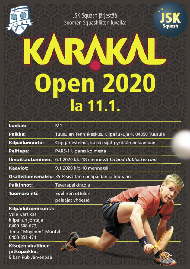 JSK Squash järjestää kansallisen Karakal Openin 11.1.2020 Tuusulan Squashkeskuksessa. Kaaviot on julkaistu Club Lockerissa. Kilpailu pelataan ”paras kolmesta” -systeemillä.