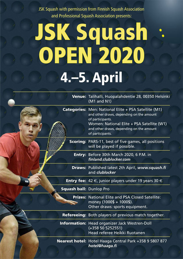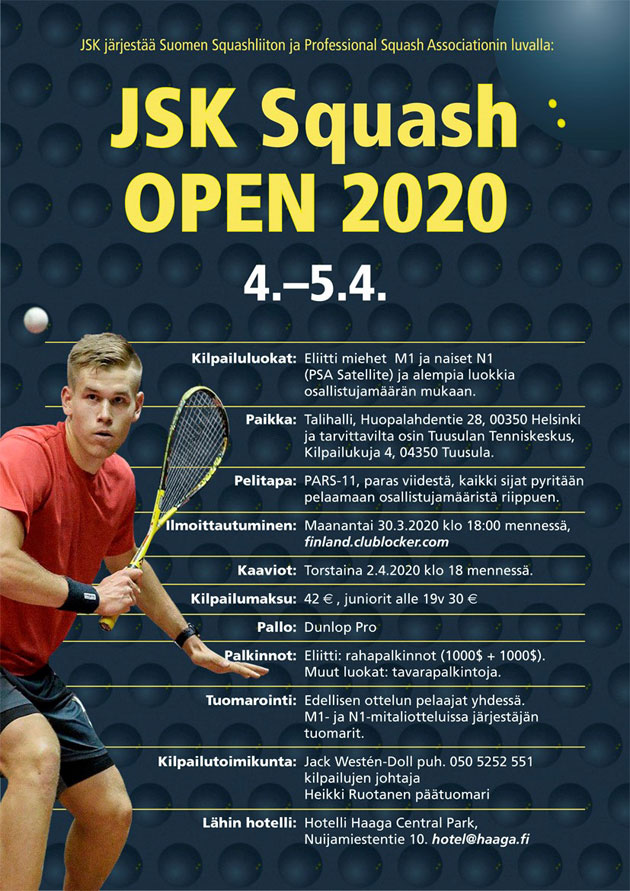 JSK-Squash järjestää JSK Squash Open-turnauksen Talihallissa Helsingissä 4.-5.4.2020. Ilmoittautuminen on auki Club Lockerissa